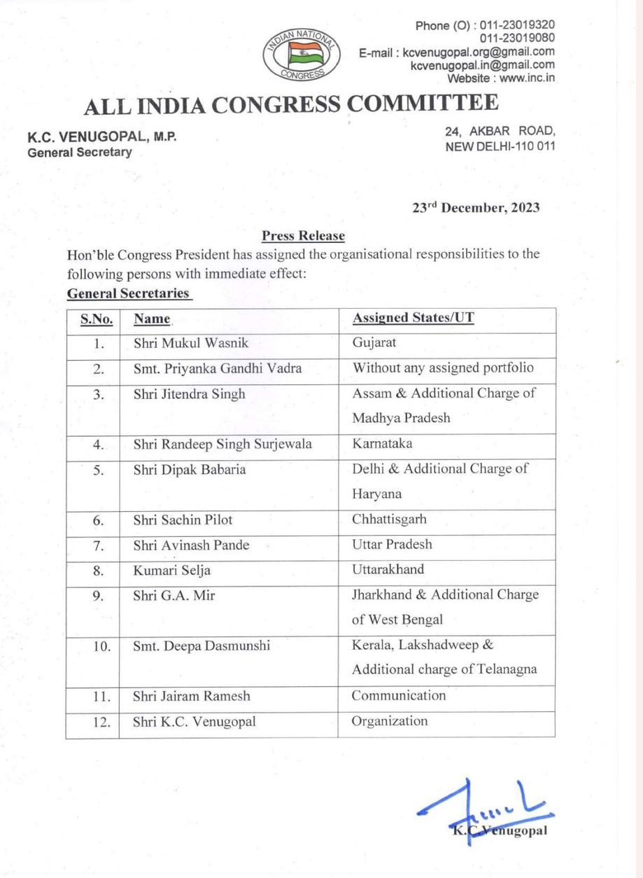 नई दिल्ली. कांग्रेस संगठन में शनिवार को बड़ा फेरबदल किया गया है. पार्टी अध्यक्ष मल्लिकार्जुन खड़गे ने अपनी टीम का ऐलान करते हुए प्रियंका गांधी से उत्तर प्रदेश का प्रभार वापस ले लिया है और उनकी जगह अविनाश पांडेय को जिम्मेदारी दी गई है. वहीं, सचिन पायलट को छत्तीसगढ़ का प्रभार और मोहन प्रकाश को बिहार का प्रभारी बनाया गया है, जबकि सुखजिंदर सिंह रंधावा राजस्थान के प्रभारी बने रहेंगे.