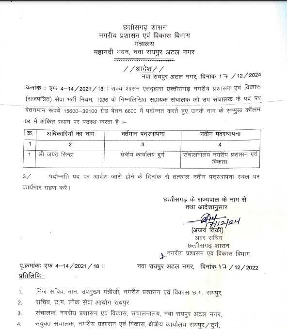 जयंत सिन्हा, जो अब तक क्षेत्रीय कार्यालय, दुर्ग में कार्यरत थे, उन्हें पदोन्नति के बाद संचालनालय नगरीय प्रशासन एवं विकास में स्थानांतरित किया गया है। वहीं, क्रांति अशोक कुमार, जो क्षेत्रीय कार्यालय, बिलासपुर में कार्यरत थे, उन्हें पदोन्नति के बाद कार्यालय संयुक्त संचालक, बिलासपुर में पदस्थ किया गया है।