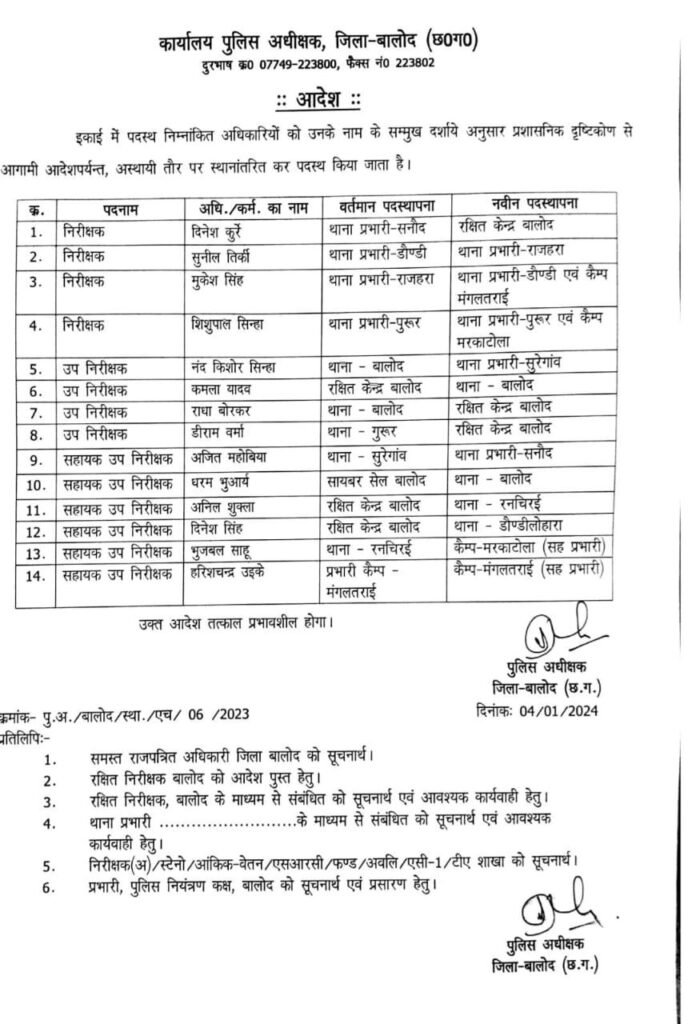 बालोद: एसपी के चार निरीक्षक,चार उप निरीक्षक,6 सहायक उप निरीक्षक का तबादला हुआ है।