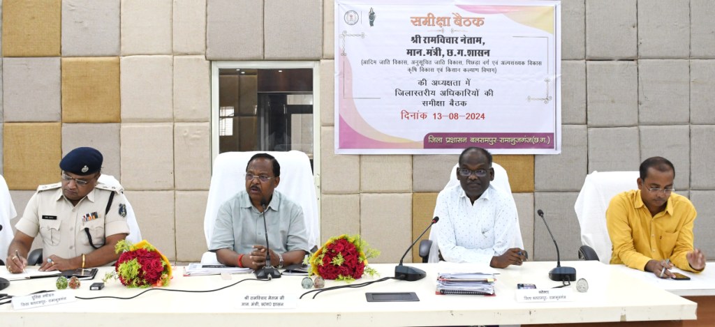 बलरामपुर: आदिम जाति एवं अनुसूचित जाति विकास, पिछड़ा वर्ग एवं अल्पसंख्यक विकास, कृषि विकास एवं किसान कल्याण विभाग मंत्री रामविचार नेताम ने संयुक्त जिला कार्यालय भवन के सभाकक्ष में जिला स्तरीय अधिकारियों की बैठक लेकर योजनाओं की समीक्षा की। इस दौरान उन्होंने जिले के अंतर्गत इस सत्र में स्वीकृत और पूर्व से चल रहे अधोसंरचनात्मक कार्यों की प्रगति की जानकारी लेते हुए अधिकारियों को आवश्यक दिशा-निर्देश दिए। मंत्री श्री नेताम ने विभागवार योजनाओं के क्रियान्वयन की स्थिति की जानकारी ली और कहा की शासन के मंशानुरूप योजनाओं को समाज के अंतिम पंक्ति के व्यक्ति तक पहुंचाने में अधिकारियों की महत्वपूर्ण भूमिका होती हैं इसलिए सभी अधिकारी अपनी जिम्मेदारी का निर्वहन पूरी निष्ठा से करें ताकि पात्र हितग्राहियों को शासन की सभी योजनाओं का लाभ मिल सके। बैठक में कलेक्टर रिमिजियुस एक्का, पुलिस अधीक्षक राजेश अग्रवाल, अपर कलेक्टर श्री इन्द्रजीत बर्मन, संयुक्त कलेक्टर आर.एन. पाण्डेय सहित जिला स्तरीय अधिकारी उपस्थित थे।