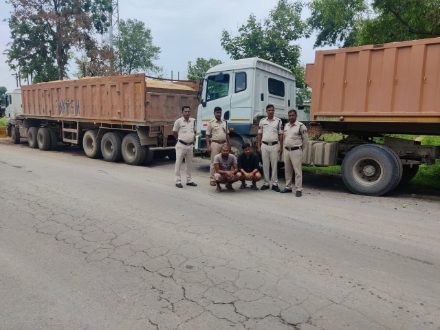 एसडीओपी प्रतापपुर अमोलक सिंह के मार्गदर्शन में चौकी रेवटी की पुलिस रेत चोरी कर परिवहन की सूचना पर चौकी के सामने नाकाबंदी लगाकर वाहनों की चेकिंग की जा रही थी इसी दौरान रेत से लदे 2 ट्रेलर वाहन वहां पहुंचे जिसकी तलाशी लेने पर उसमें रेत लोड़ पाया गया। वाहन चालकों से ट्रेलर में लोड़ रेत का वैध दस्तावेज की मांग किए जाने पर कोई दस्तावेज प्रस्तुत नहीं किए। दोनों ट्रेलर वाहनों में लोड़ रेत चोरी का होने पर धारा 379 के तहत कार्यवाही करते हुए रेत लोड़ ट्रेलर क्रमांक यूपी 50 डीटी 0127 एवं ट्रेलर क्रमांक यूपी 53 एचटी 1229 दोनों वाहन कीमती करीब 40 लाख एवं रेत कीमत करीब 20 हजार रूपये को जब्त कर आरोपी बृजराज यादव पिता पंचम यादव उम्र 28 वर्ष ग्राम लारपुर, थाना मुबारकपुर जिला आजमगढ़ उत्तरप्रदेश एवं राजेश यादव पिता बाबुराम यादव उम्र 28 वर्ष ग्राम सैदपुर, थाना महाराजगंज, जिला आजमगढ़ उत्तरप्रदेश को गिरफ्तार किया गया। रेत चोरी कर झिलमिली से उत्तरप्रदेश की ओर ले जा रहे थे। इस कार्यवाही में चौकी प्रभारी रेवटी शिवकुमार खुटे, प्रधान आरक्षक मोरिस खाखा, अखिलेश यादव, आरक्षक बलिन्दर खलखो, शैलेन्द्र सिंह व धीरन सिंह सक्रिय रहे।