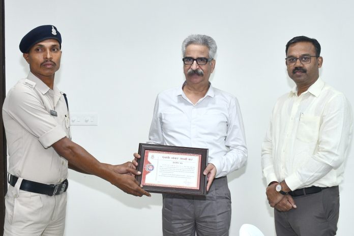 रायपुर: पुलिस महानिदेशक अशोक जुनेजा द्वारा डायल 112 के कर्मचारियों, आरक्षक बिपिन किशोर खलखो और चालक छोटू दास को उनके अद्वितीय कार्य के लिए सम्मानित किया गया।